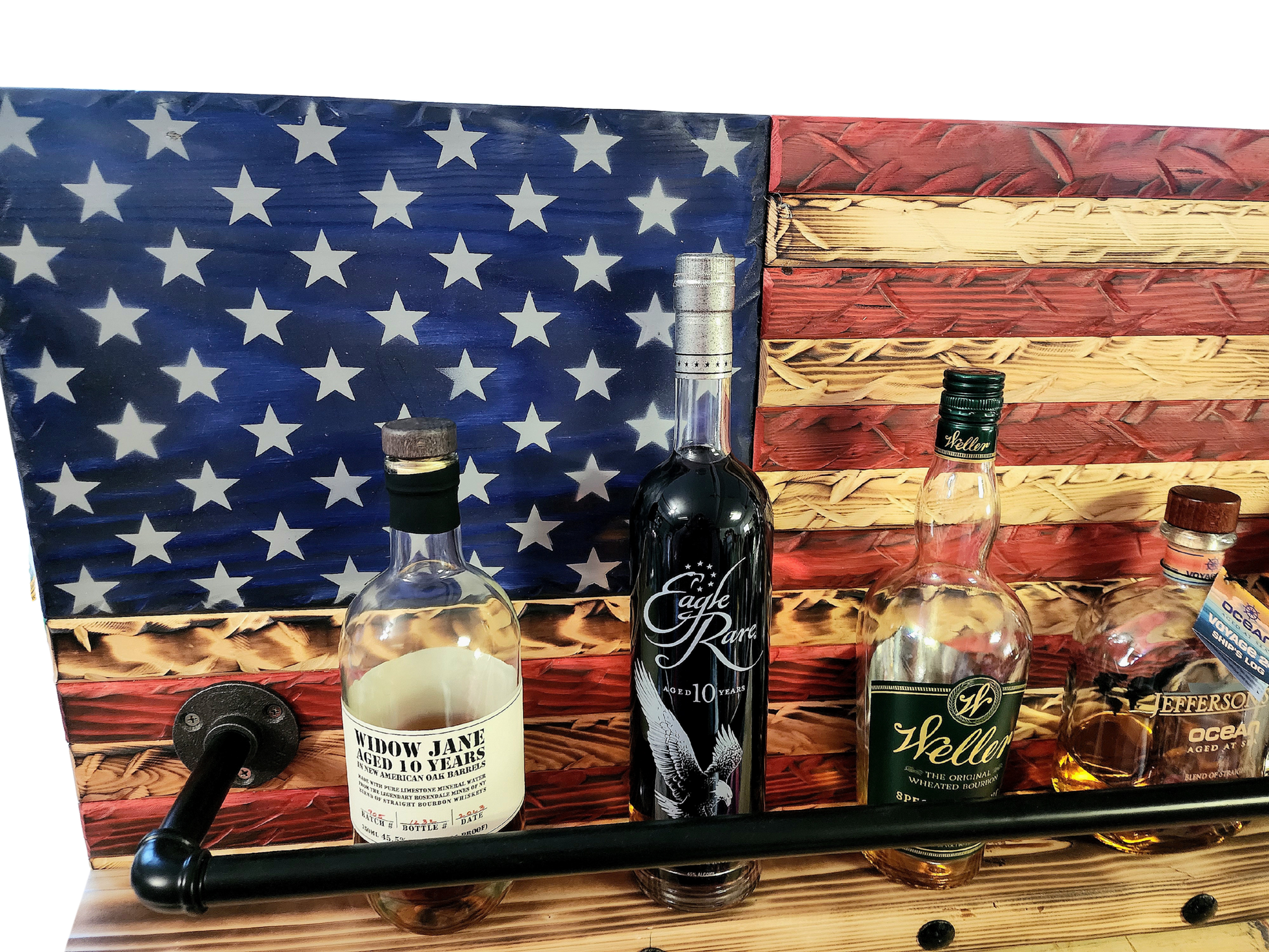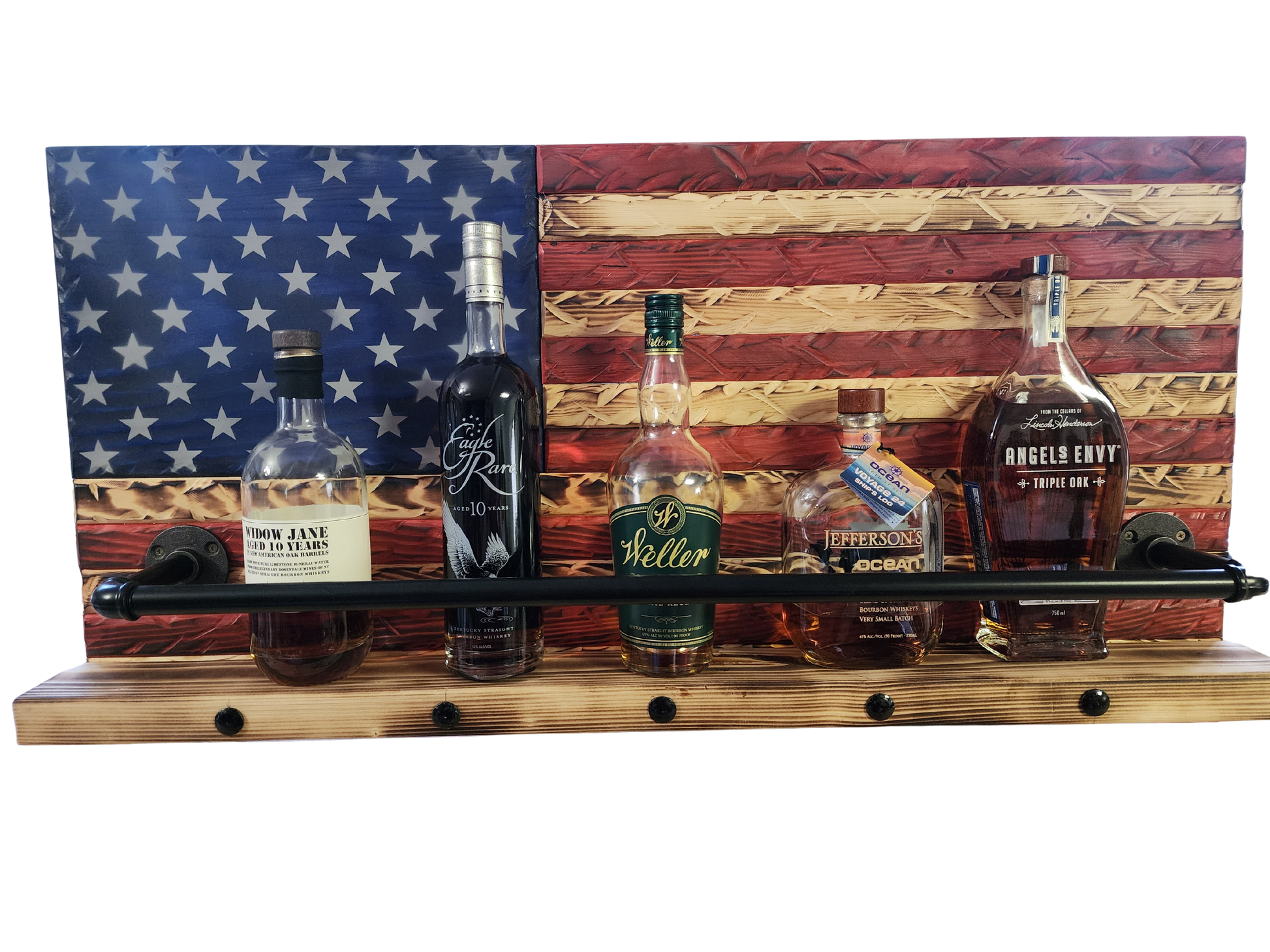 Display your favorite bottles with pride and craftsmanship. This Rustic American Wooden Flag Bourbon Wall Display Shelf combines functionality with patriotic design. Handcrafted from solid wood, each piece features a distressed finish and detailed wood-burned flag grain, creating a bold statement for any room. Sturdy and durable, it’s perfect for showcasing bourbon, whiskey, or collectibles while adding a touch of rustic Americana to your home bar, office, or living space.